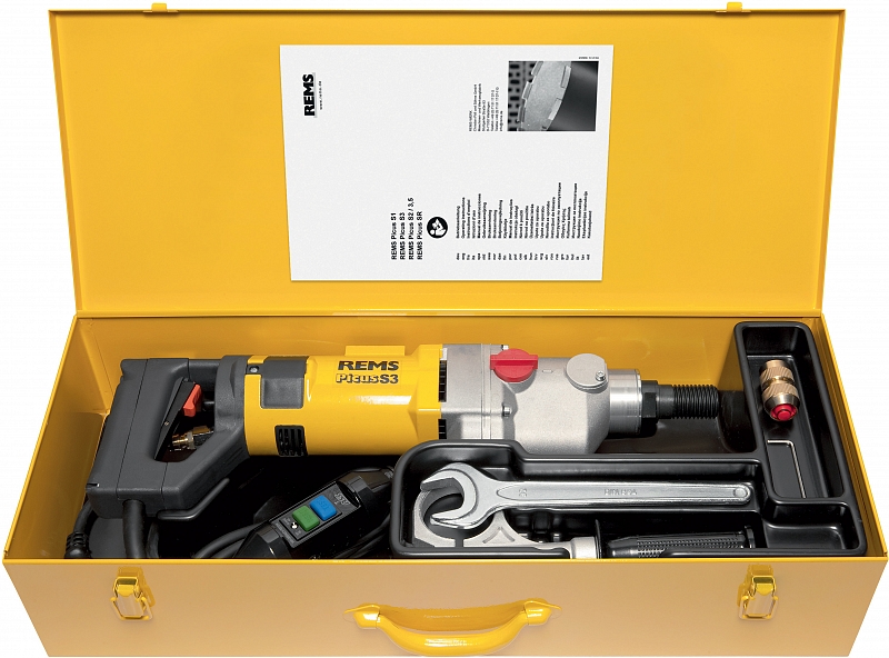 Rems Пикус S3 Basic-Pack с универсальными алмазными сверлильными коронками Rems UDKB Ø 62 – 82 – 132 мм и стойкой Rems Титан, включая инструменты и комплект крепежа для кирпичной кладки и бетона. Другие сетевые напряжения по запросу.